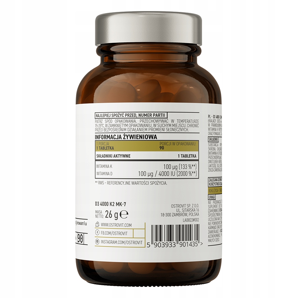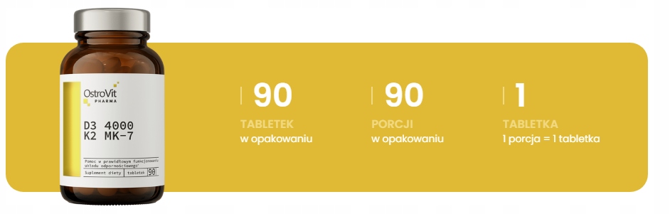 ✅ Źródło witaminy D3 i K2 - jedna porcja preparatu zawiera 4000 IU cholekalcyferolu oraz 100 µg menachinonu-7-MK-7.