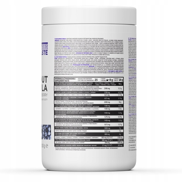- Źródło aminokwasów rozgałęzionych i innych, wartościowych składników - porcja suplementu diety dostarcza do organizmu 2500 mg BCAA, 2000 mg jabłczanu cytruliny, 1500 mg L-glutaminy, a także 1450 mg monohydratu kreatyny i 1450 mg jabłczanu kreatyny. Dodatkowo preparat zawiera 1000 mg tauryny, 1000 mg glicyny i 800 mg beta-alaniny oraz 500 mg witaminy C, 300 mg potasu, 200 mg sodu i 57 mg magnezu.