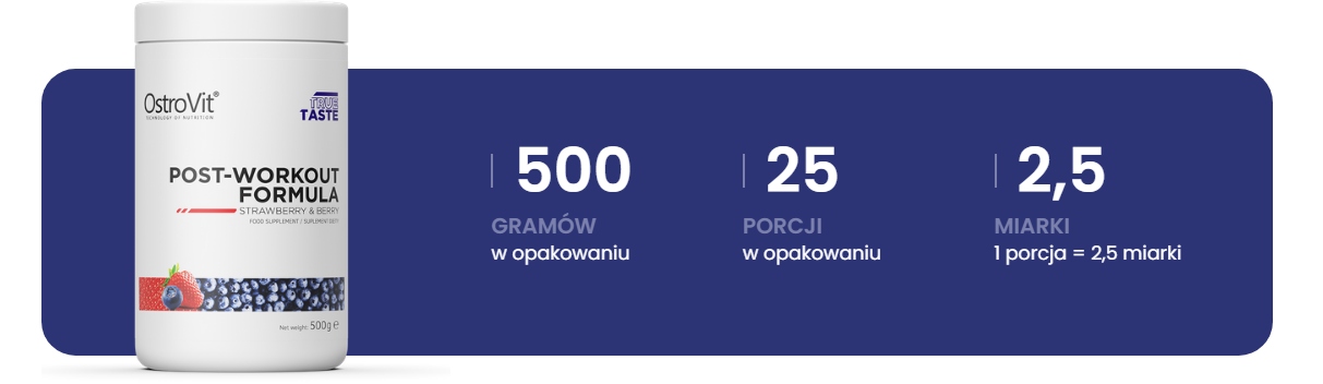 OstroVit Post-Workout Formula to kompleksowy suplement diety, który zawiera unikatową formułę aminokwasów, elektrolitów, a także witamin i składników mineralnych. To potreningówka dostępna w postaci proszku, w dwóch wyjątkowych wariantach smakowych. To produkt bez dodatku cukru, stworzony z myślą o sportowcach i osobach aktywnych fizycznie, którym zależy na dostarczeniu do organizmu cennych składników po zakończeniu treningu.