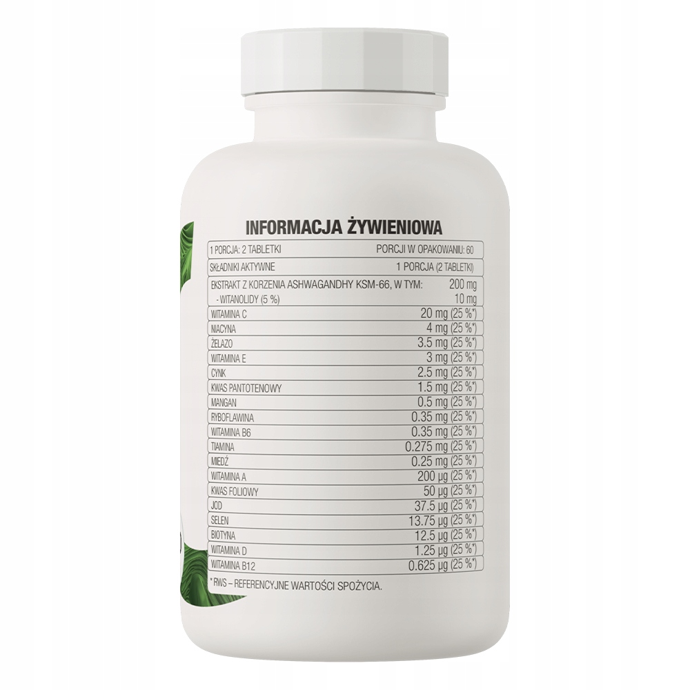 Składniki: Sole magnezowe kwasu cytrynowego, ekstrakt z korzenia ashwagandhy (Withania somnifera L. Dunal) - KSM-66 Ashwagandha® standaryzowany na 5% witanolidów, substancja wypełniająca: celuloza mikrokrystaliczna; węglan wapnia, maltodekstryna, kwas L-askorbinowy, skrobia, diglicynian żelaza (II), pikolinian cynku, octan DL-alfa tokoferylu, substancje przeciwzbrylające: dwutlenek krzemu, sole magnezowe kwasów tłuszczowych; heksanikotynian inozytolu, diglicynian manganu, L-selenometionina, diglicynian miedzi, octan retinylu, D-pantotenian wapnia, cholekalcyferol, ryboflawina, chlorowodorek pirydoksyny, chlorowodorek tiaminy, kwas pteroilomonoglutaminowy, jodek potasu, D-biotyna, cyjanokobalamina.