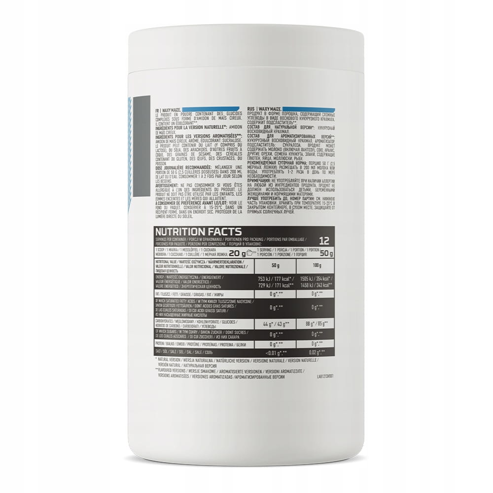 OstroVit Waxy Maize to produkt, który zawiera starannie wyselekcjonowane węglowodany złożone w postaci woskowej skrobi kukurydzianej. To preparat o pysznym smaku i prostym składzie, dostępny w wygodnej formie proszku, stworzony z myślą o sportowcach i osobach aktywnych fizycznie.