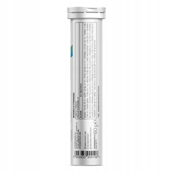 Składniki: Regulatory kwasowości: kwas cytrynowy, wodorowęglan sodu; substancja wypełniająca: sorbitole; cytrynian potasu, sole magnezowe kwasu cytrynowego, węglan wapnia, maltodekstryna, stabilizator: glikol polietylenowy; kwas L- askorbinowy, aromat pomarańczowy, diglicynian żelaza (II), pikolinian cynku, octan DL- alfa-tokoferylu, koncentrat buraka czerwonego, L-selenometionina, substancje słodzące: aspartam, sacharynian sodu; barwnik: beta – karoten; naturalny aromat cytrynowy z innymi naturalnymi aromatami; kwas nikotynowy, ryboflawina, chlorowodorek tiaminy, D- pantotenian wapnia, cholekalcyferol, octan retinylu, diglicynian manganu, diglicynian miedzi, pikolinian chromu, chlorowodorek pirydoksyny, kwas pteroilomonoglutaminowy, cyjanokobalamina, D-biotyna.