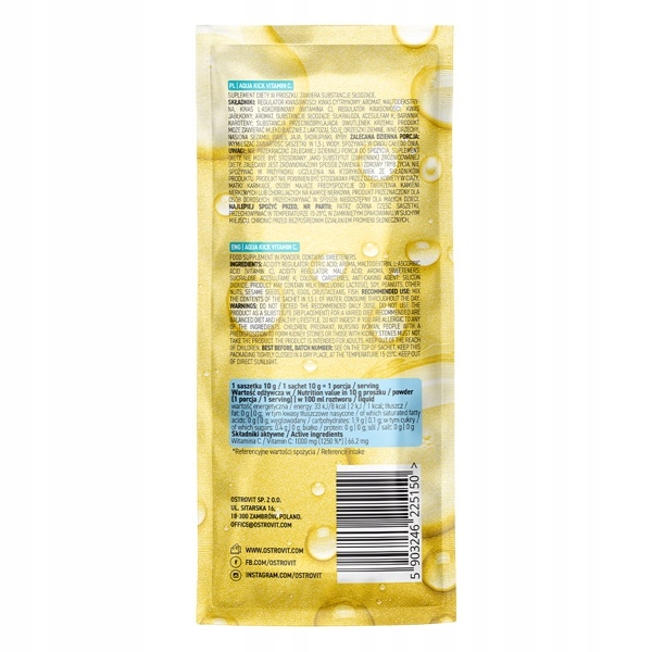 OstroVit Aqua Kick Vitamin C to suplement diety, dzięki któremu w łatwy i szybki sposób dostarczysz do organizmu niezbędną dzienną dawkę witaminy C. Ten znany ze swoich silnych właściwości antyoksydacyjnych składnik pełni w organizmie wiele bardzo ważnych funkcji, a jego niedobory mogą okazać się bardzo dotkliwe. Jeżeli Twoja dieta jest uboga w witaminę C oraz czujesz stałe osłabienie organizmu, saszetki OstroVit Aqua Kick Vitamin C o smaku cytrynowo-limonkowym mogą być rozwiązaniem Twoich problemów.