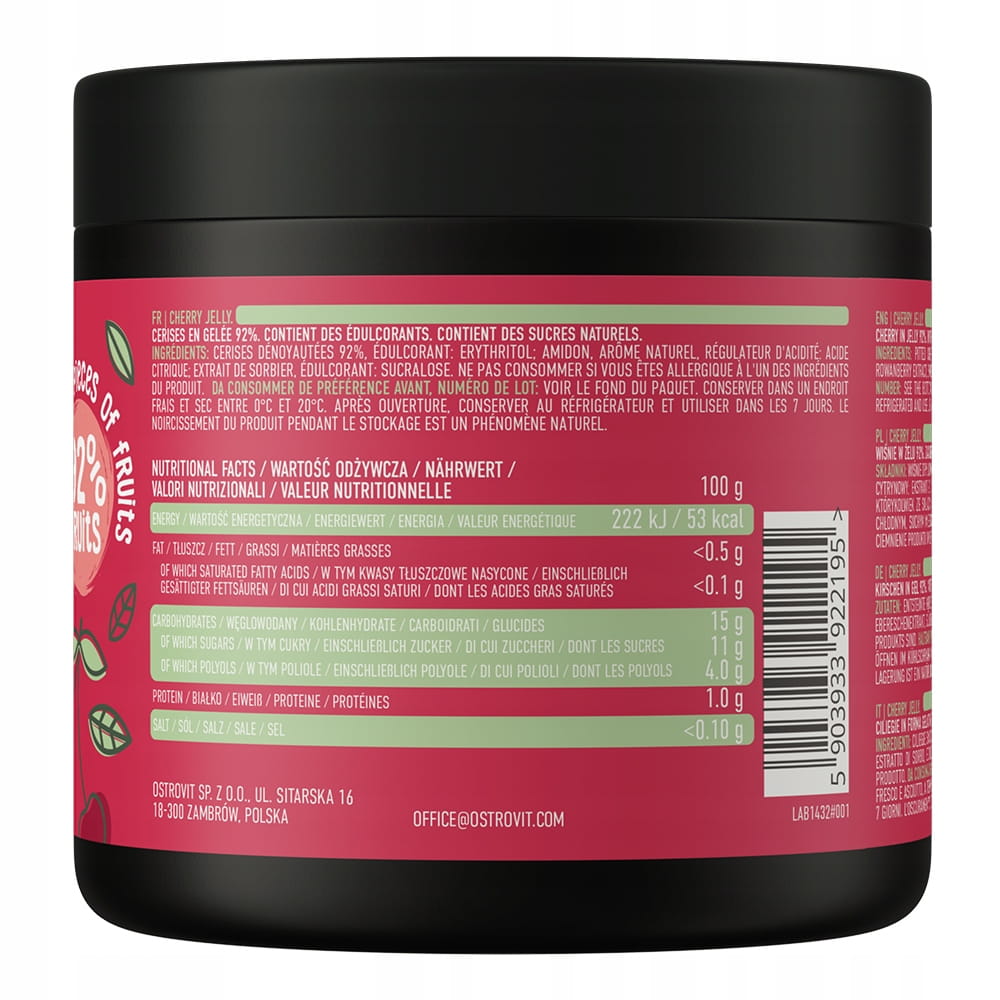 OstroVit Cherry Jelly 500 g to owoce w żelu o smaku soczystych wiśni bez dodatku cukru! Produkt stanowi doskonałe uzupełnienie deserów, naleśników, placków oraz dietetycznych przekąsek u wszystkich, którzy dbają o niski indeks glikemiczny w codziennej diecie. Jeśli dbasz o wartościowość swoich posiłków - wypróbuj zdrowszą alternatywę do wysokokalorycznych dżemów w postaci owoców w żelu OstroVit bez dodatku cukru. Wybierz swój ulubiony smak i ciesz się nim bez wyrzutów sumienia!