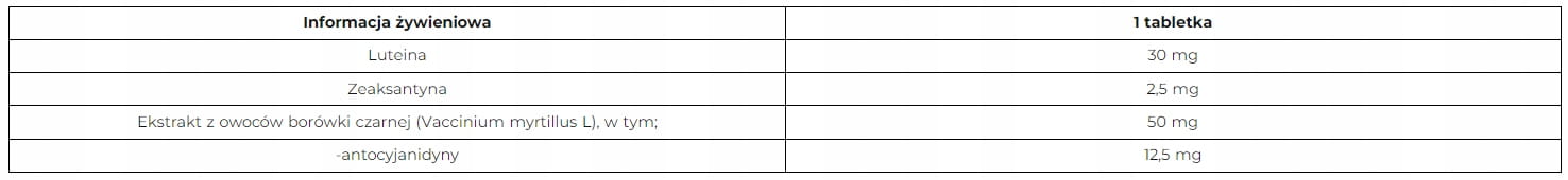 maltodekstryna, ekstrakt z owoców borówki czarnej (Vaccinium myrtillus L.) 25% antocyjanidyn; luteina i zeaksantyna (z Tagetes erecta L.), substancja wypełniająca – sól sodowa karboksymetylocelulozy usieciowana; substancje glazurujące - alkohol poliwinylowy (PVA), talk, glikol polietylenowy, monooleinian polioksyetylenosorbitolu; substancje przeciwzbrylające – sole magnezowe kwasów tłuszczowych, dwutlenek krzemu; barwniki - dwutlenek tytanu, tlenki i wodorotlenki żelaza.
