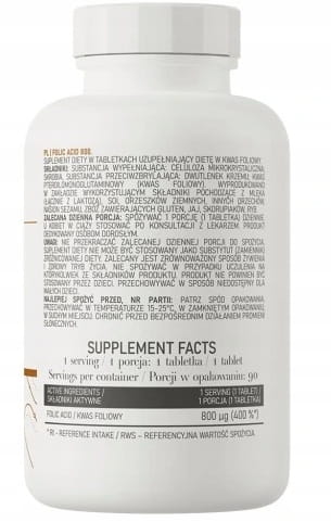 Folic Acid marki OstroVit to suplement diety zawierający aż 400 mcg kwasu foliowego w każdej tabletce! Składnik ten należy do witamin z grupy B, a jego stosowanie przynosi wiele korzyści związanych z układem nerwowym. Ponadto polecany jest także kobietom planującym ciążę, gdyż pozwala na prawidłowy rozwój płodu. Produkt ten to również wsparcie dla sportowców oraz osób ciężko pracujących zarówno umysłowo, jak i również fizycznie. Wystarczy jedna tabletka dziennie, aby pokryć zapotrzebowanie organizmu na ten niezwykle istotny składnik.