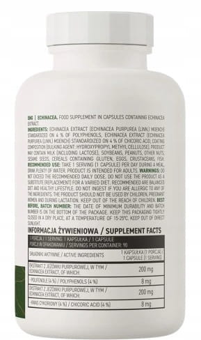 - Źródło cennych składników - jedna porcja suplementu diety dostarcza do organizmu 200 mg ekstraktu z jeżówki purpurowej standaryzowanego na 4% polifenoli oraz 200 mg ekstraktu z jeżówki purpurowej standaryzowanego na 4% kwasu cykoriowego.