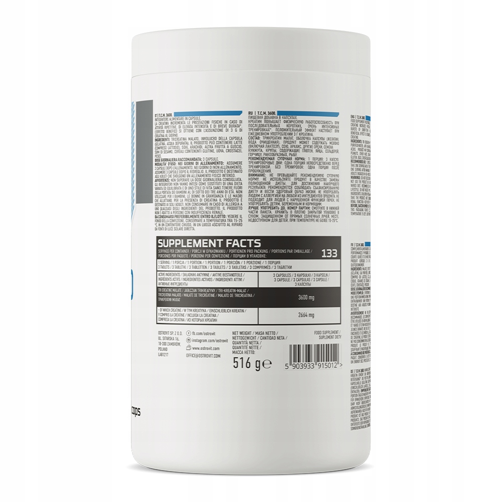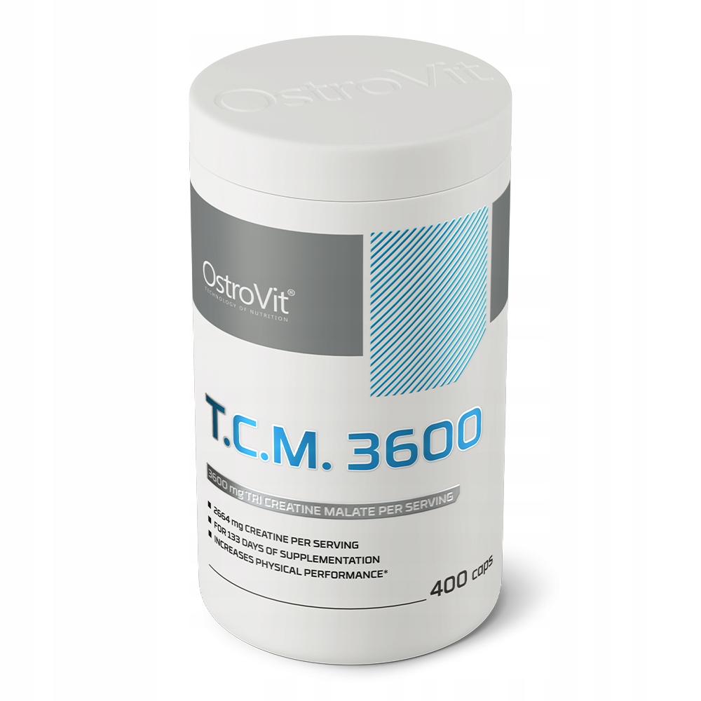OstroVit T.C.M. 3600 mg to wysokiej jakości suplement diety, który stanowi źródło jabłczanu kreatyny. To preparat o prostym składzie, dostępny w postaci łatwych do połknięcia kapsułek, stworzony z myślą o sportowcach i osobach aktywnych fizycznie.