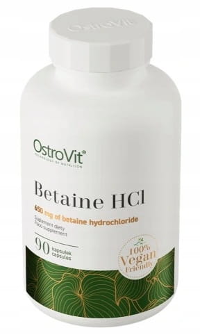- WEGAŃSKA FORMUŁA - OstroVit Betaina HCl VEGE to środek, który może być z powodzeniem stosowany przez osoby na diecie wegetariańskiej oraz wegańskiej. Zarówno sam suplement, jak i otoczka kapsułki nie zawierają składników pochodzenia zwierzęcego.