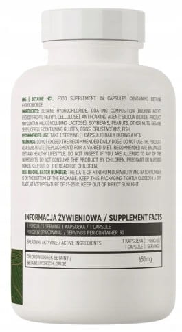 Składniki: Chlorowodorek betainy, otoczka kapsułki (substancja wypełniająca: hydroksypropylometyloceluloza), substancja przeciwzbrylająca: dwutlenek krzemu.