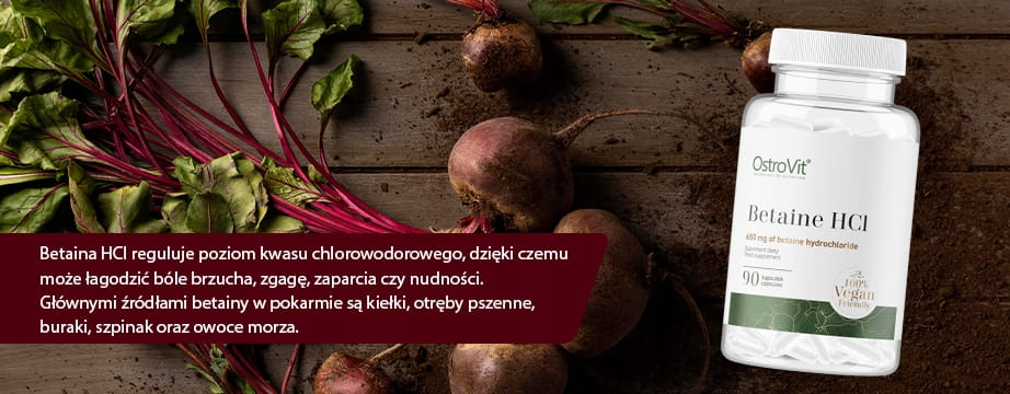 Zaburzenia w produkcji kwasu żołądkowego są częstą przypadłością, pojawiającą się w szczególności u osób, które niezdrowo się odżywiają, są narażone na stres lub regularnie spożywają alkohol. Betaina HCl reguluje poziom kwasu chlorowodorowego, dzięki czemu może łagodzić bóle brzucha, zgagę, zaparcia czy nudności.