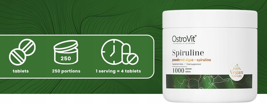 OstroVit Spiruline to suplement diety w tabletkach zawierający ekstrakt ze spiruliny. Spirulina jest to niebiesko-zielony glon, który zwany jest również algą porastającą jeziora i inne zbiorniki słodkowodne.