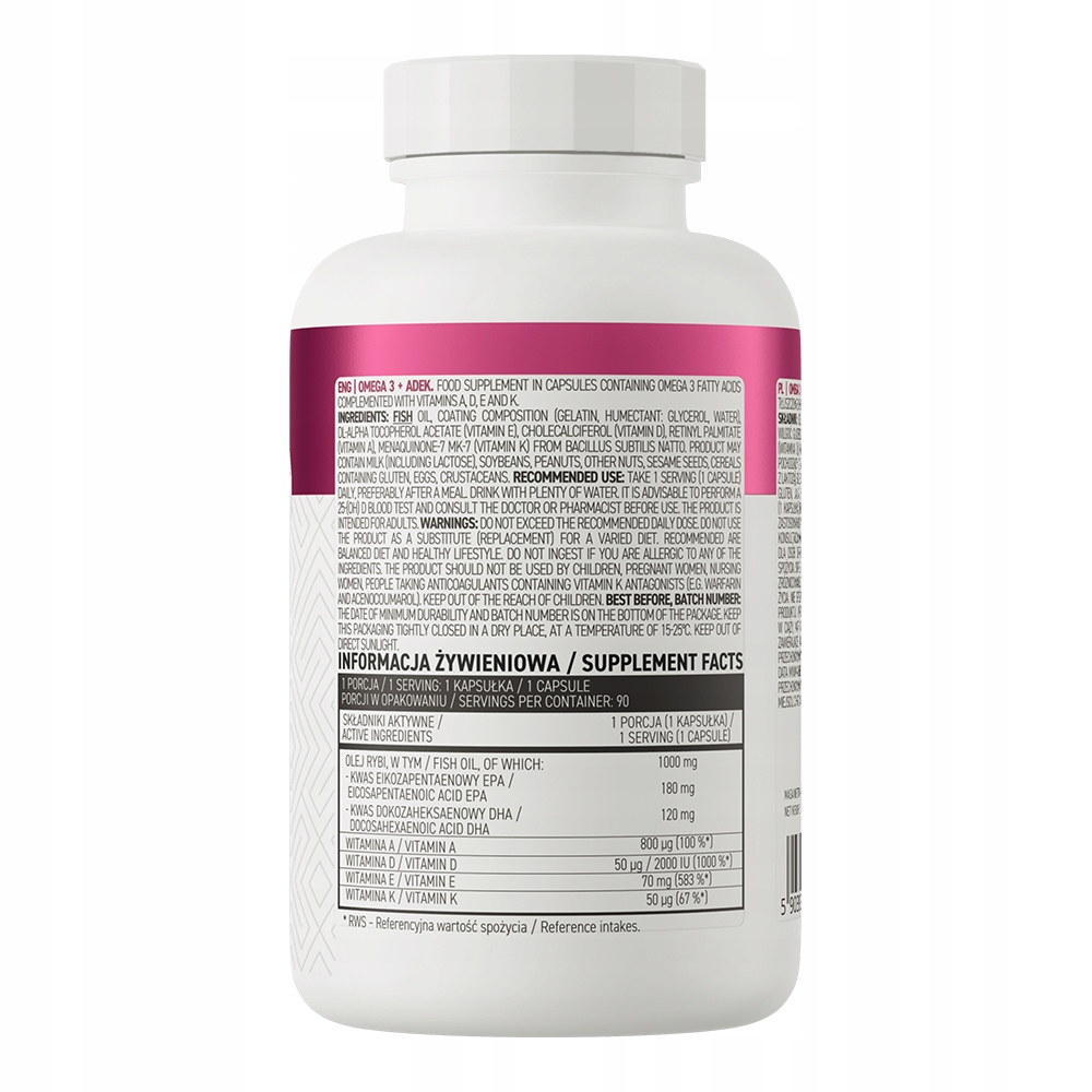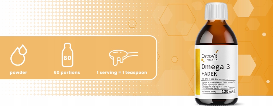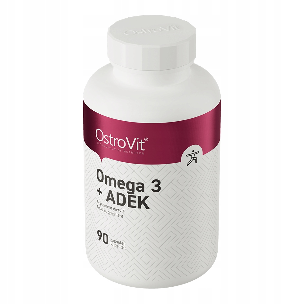 - OstroVit Omega 3 + ADEK to wysokiej jakości suplement diety, który zawiera wielonienasycone kwasy tłuszczowe omega-3, takie jak kwas eikozapentaenowy (EPA) oraz kwas dokozaheksaenowy (DHA), a jednocześnie dostarcza do ustroju cenne witaminy rozpuszczalne w tłuszczach - witaminę A, D, a także witaminę E i K.