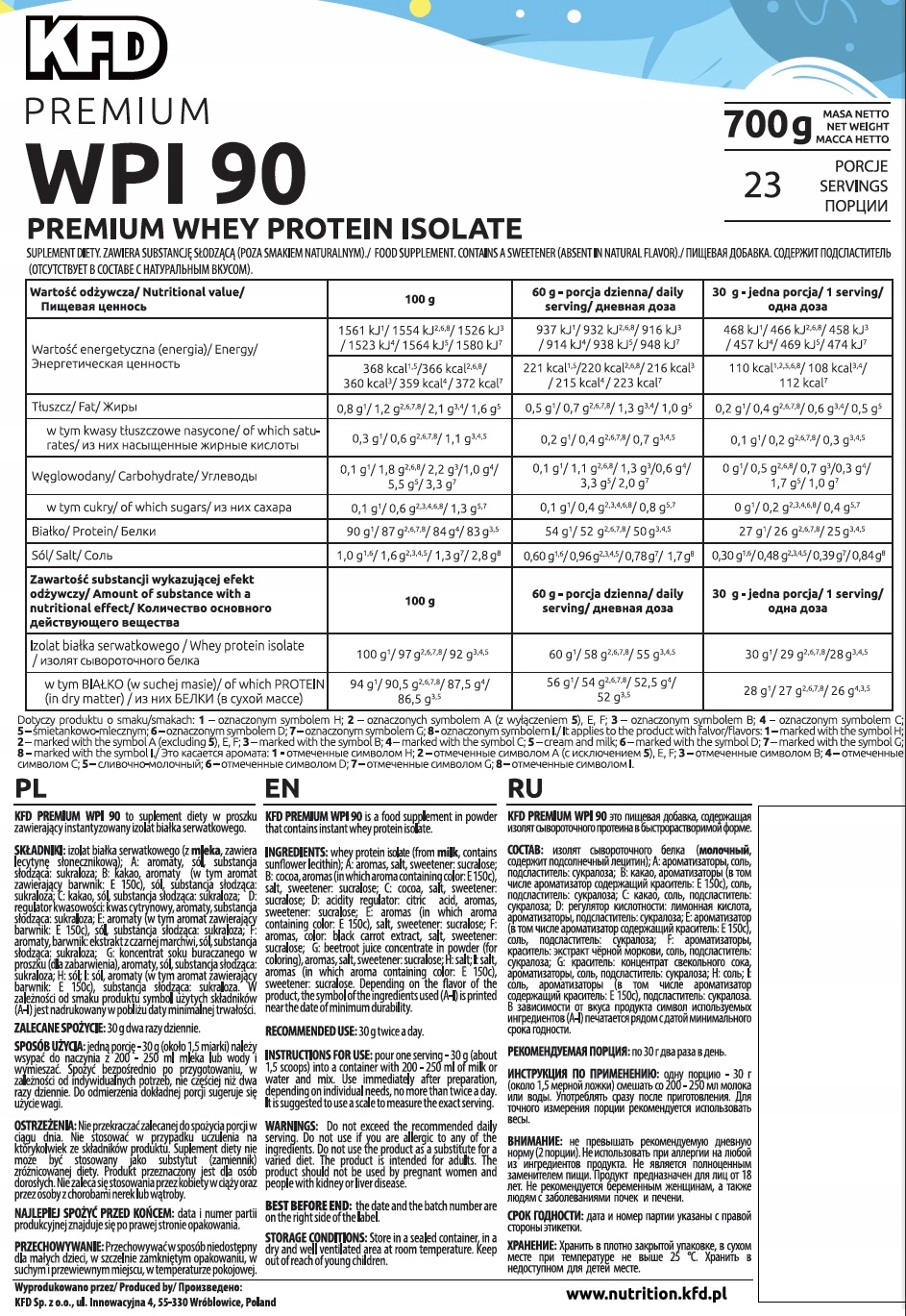 Produkt firmy KFD uzyskiwany jest przy wykorzystaniu procesu ultrafiltracji, w którym tłuszcze oraz cukry są efektywniej separowane od białek. Ponadto w skład WPI wchodzą wyjątkowe frakcje serwatki, takie jak glikomakropeptydy, alfa i beta-laktoalbuminy oraz immunoglobuliny.