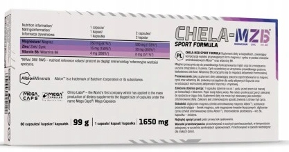 - WYSOKA DAWKA CYNKU – każda z kapsułek Chela MZB Sport Formula Mega Caps zawiera aż 15mg cynku, który korzystnie wpływa na utrzymanie odpowiedniego poziomu testosteronu we krwi